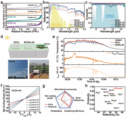 通过对RCSF的光学性能和户外性能测试(图3),该纤维表现出优异的辐射制冷性能,能实高反射率(93.7%)与高红外发射率(0.98)的协同,同时在户外 800 W/m2太阳辐射下实现 100.1 W/m2净制冷功率,较再生纤维素纤维降温5 °C。