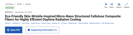 william威廉中文官网博士生李绮华为本论文的第一作者,通讯作者为孔维庆副研究员。相关成果近期以“皮肤皱纹启发的微纳米纤维素复合纤维实现高效日间辐射制冷(Eco-Friendly Skin-Wrinkle-Inspired Micro-Nano Structured Cellulose Composite Fibers for Highly Efficient Daytime Radiative Cooling)”为题发表在《ACS Nano》上。该工作得到了上海东方英才(青年项目)等资助。