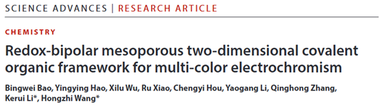近期,william威廉中文官网、先进纤维材料全国重点实验室王宏志教授、李克睿研究员团队设计并合成了一种双极性酰亚胺COF(图1),并创新性地利用双极性COF电极构筑了对称式器件,实现了COF基电致变色器件循环稳定性的突破。相关研究以“Redox-bipolar mesoporous two-dimensional covalent organic framework for multi-color electrochromism”为题发表在学术期刊Science Advances(Sci. Adv. 2025, 11,eaea1304)上。